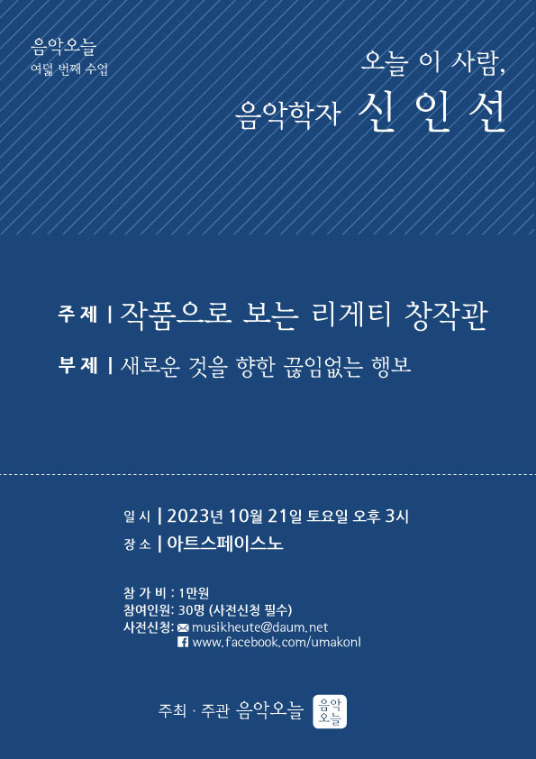 - ‘음악오늘’은 음악을 삶의 중심에 둔 다양한 음악인을 초대하여 그들이 들려주는 음악에 관해 경청하고 함께 이야기 나누는 자리를 마련하고 있습니다. '음악오늘'의 여덟 번째 수업은 일생을 음악 연구와 교육에 힘 써오신 음악학자 신인선을 모시고 그가 바라보는 작곡가 라게티에 관해 경청하고 또 궁금한 점을 질문해 보는 시간으로 꾸며집니다. 음악학자 신인선의 연구는 현대음악에 관심을 갖고 알아가는 길목에서 만나게 되는 반가운 안내자이자 선생님이 되어주고 있습니다. 특히나 작곡가 리게티는 음악학자로서 일생의 주제로 삼을 만큼 방대한 연구와 깊이는 보여주고 있습니다. 이번 수업은 리게티에 관한 그의 연구를 정리하는 시간이라는 점에서 우리 모두에게 뜻깊은 시간이라 될 것입니다. ‘음악오늘’의 여덟 번째 수업에 여러분을 초대합니다.